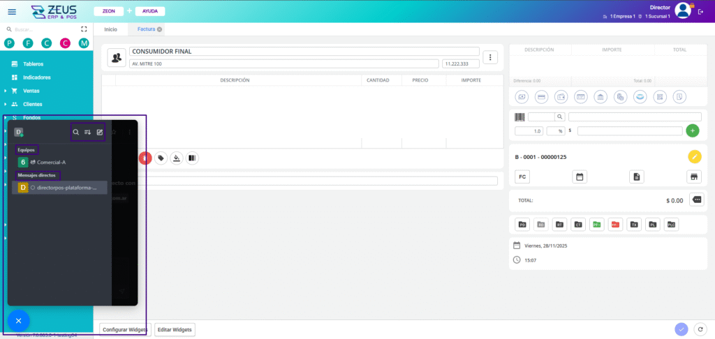 El sistema de ZEUS ERP & POS incorpora una funcionalidad para facilitar y hacer más ágil la comunicación interna entre los usuarios de una misma instancia.