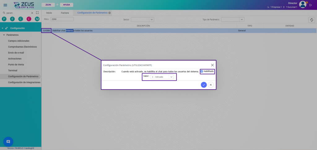 Dirigirse al Menú > Módulo Configuración > Parámetros > Configuración de Parámetros. Localizar el parámetro G–0306 (“Habilitar chat de sistema a todos los usuarios”). Seleccionar la opción Habilitado / Activado.