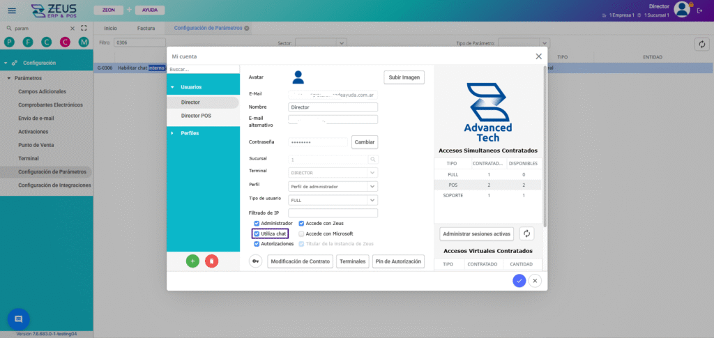 Para habilitar el chat, es necesario configurar un parámetro general y luego asignar los permisos a cada usuario.