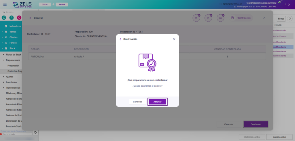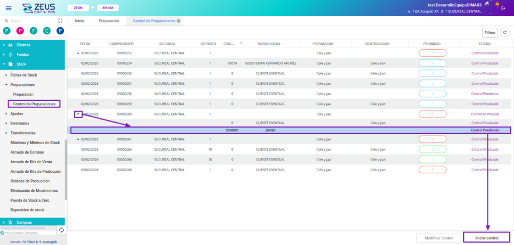 Para realizar el control de un cliente, despliega la preparación, selecciona la línea correspondiente al cliente y presiona “Iniciar control”.