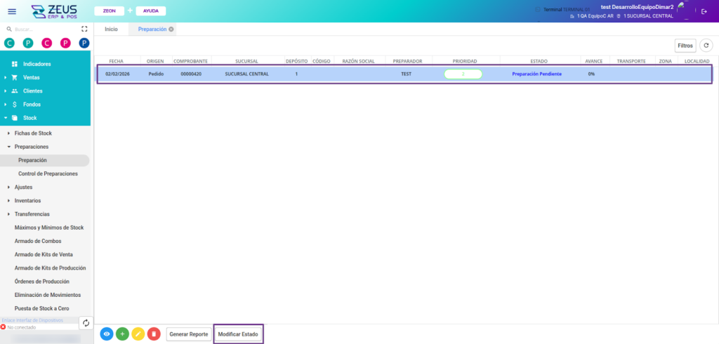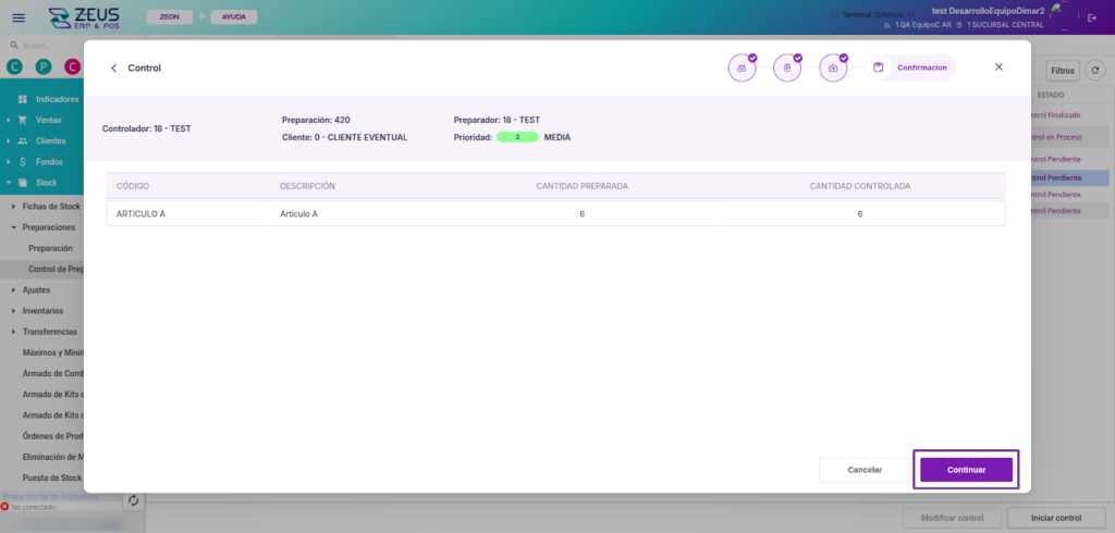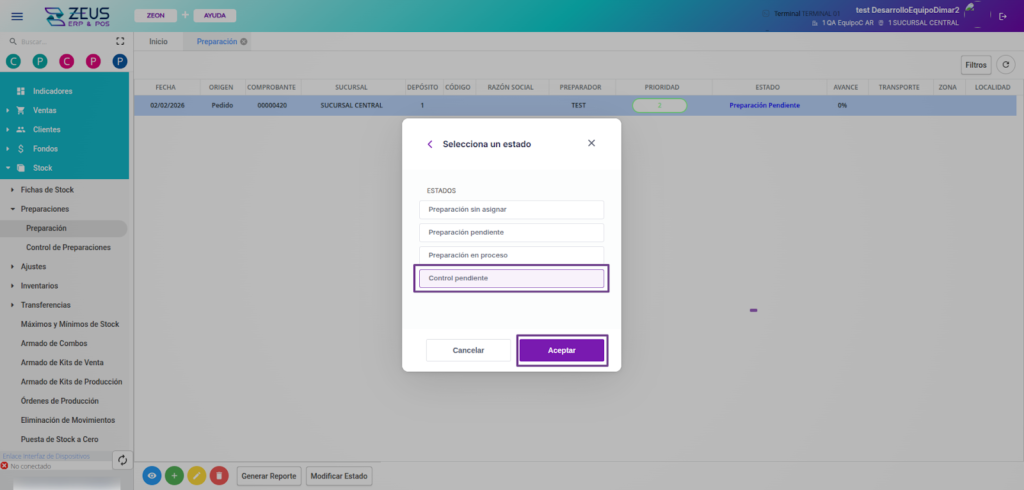 Al iniciar el proceso de pickeo, el estado de la preparación se deberá modificar a “Preparación en proceso” y luego a “Control pendiente. Esto permitirá visualizarla en la sección “Control de preparaciones”.