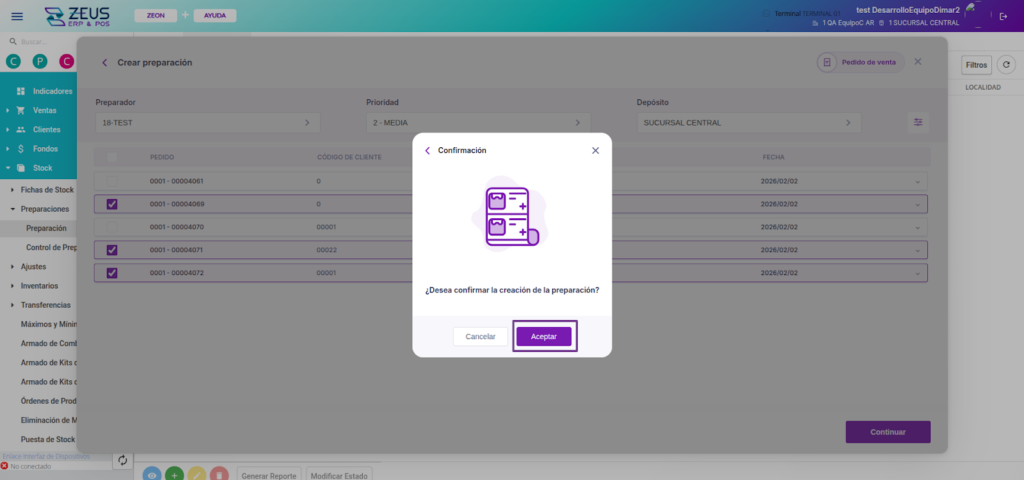 Para finalizar la creación, presiona Aceptar para validar que el stock esté disponible y poder confirmar la preparación.