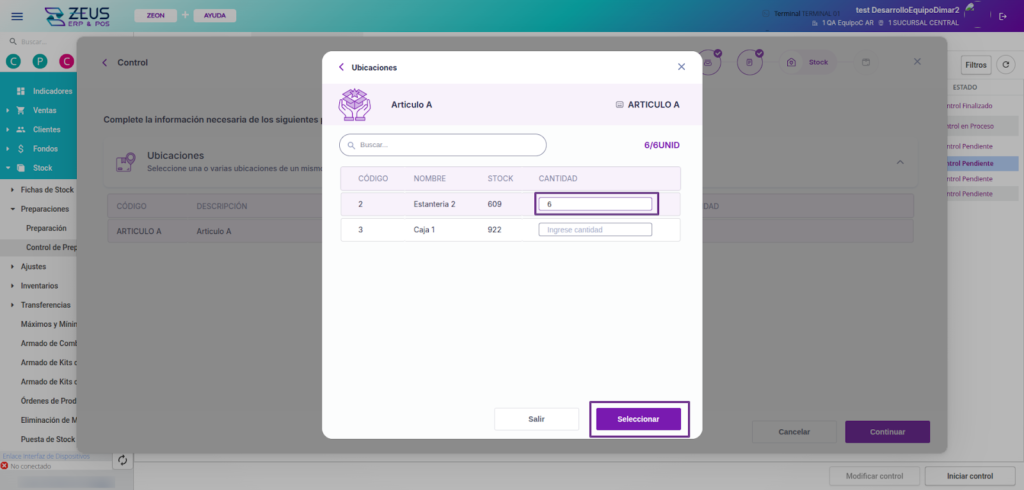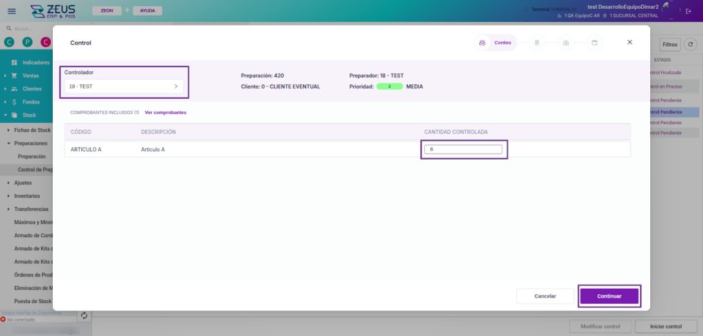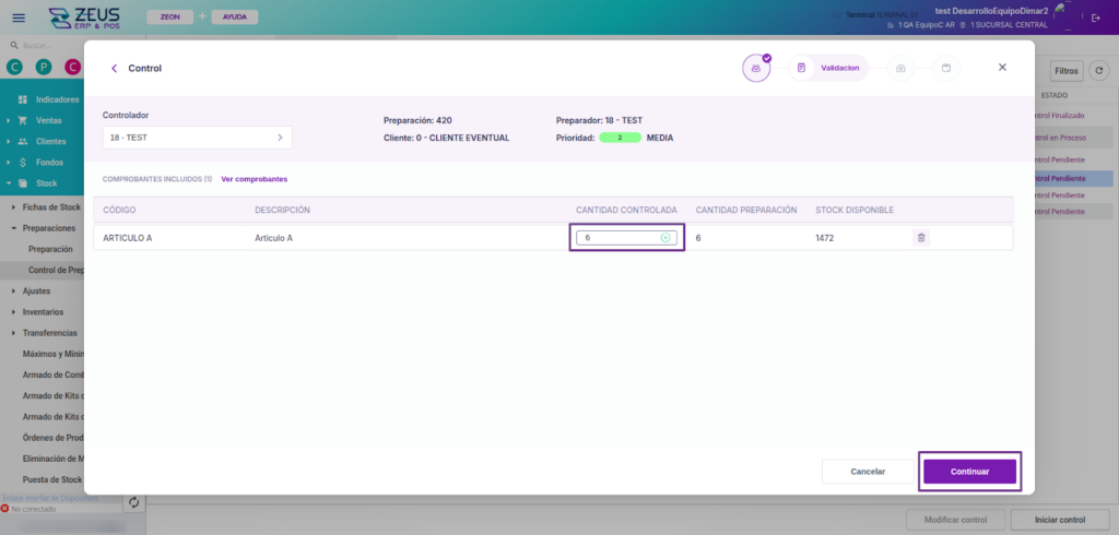 Durante el proceso de control, podrás ver las cantidades correspondientes a los pedidos del cliente seleccionado dentro de la preparación.
