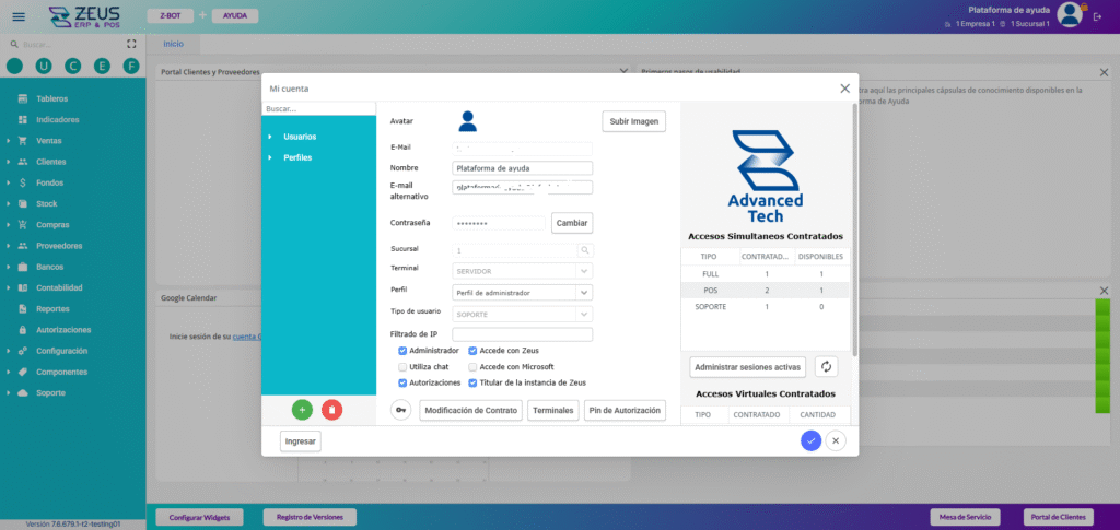 En ZEUS ERP & POS, en la esquina superior derecha de la pantalla, se encuentra disponible la opción «Mi Cuenta». A través de esta función, los usuarios pueden acceder a información relativa a los accesos contratados en ZEUS ERP & POS, así como también los perfiles y datos del plan contratado. Además, brinda la posibilidad de configurar la seguridad correspondiente a cada acceso.