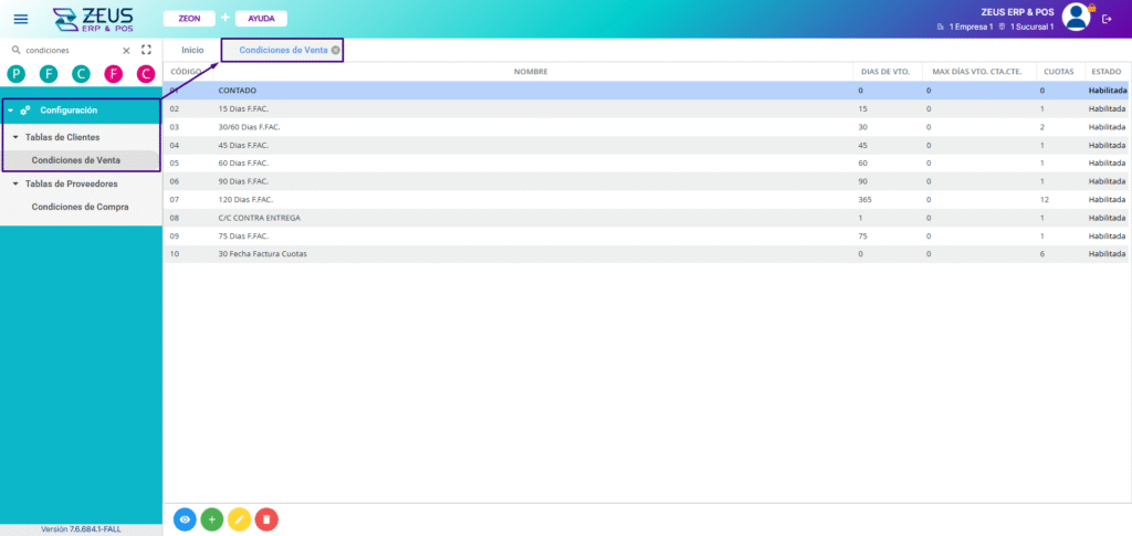 Continúe con la siguiente ruta: Configuración > Tablas de Clientes > Condiciones de Venta