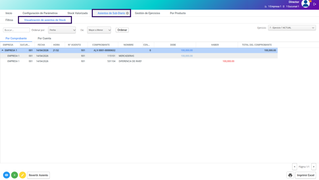 Los asientos de costos generados por los movimientos de stock pueden consultarse desde Contabilidad → Gestión de asientos → Asientos de subdiario.
