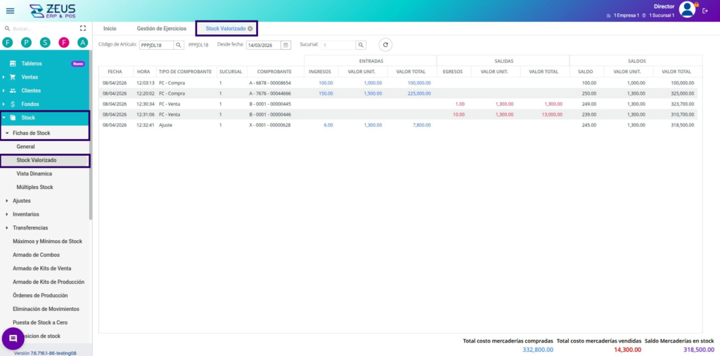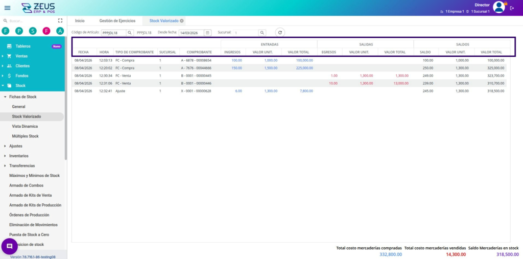 • La visualización del Stock Valorizado refleja los costos calculados según el método vigente al momento de cada movimiento.